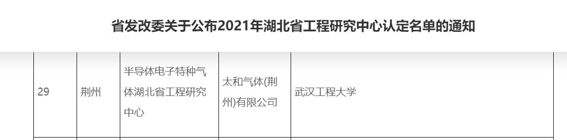 2021年12月,省發(fā)改委公布了2021年湖北省工程研究中心的認定企業(yè)名單,太和氣體牽頭創(chuàng)建的“半導體電子特種氣體湖北省工程研究中心”上榜。