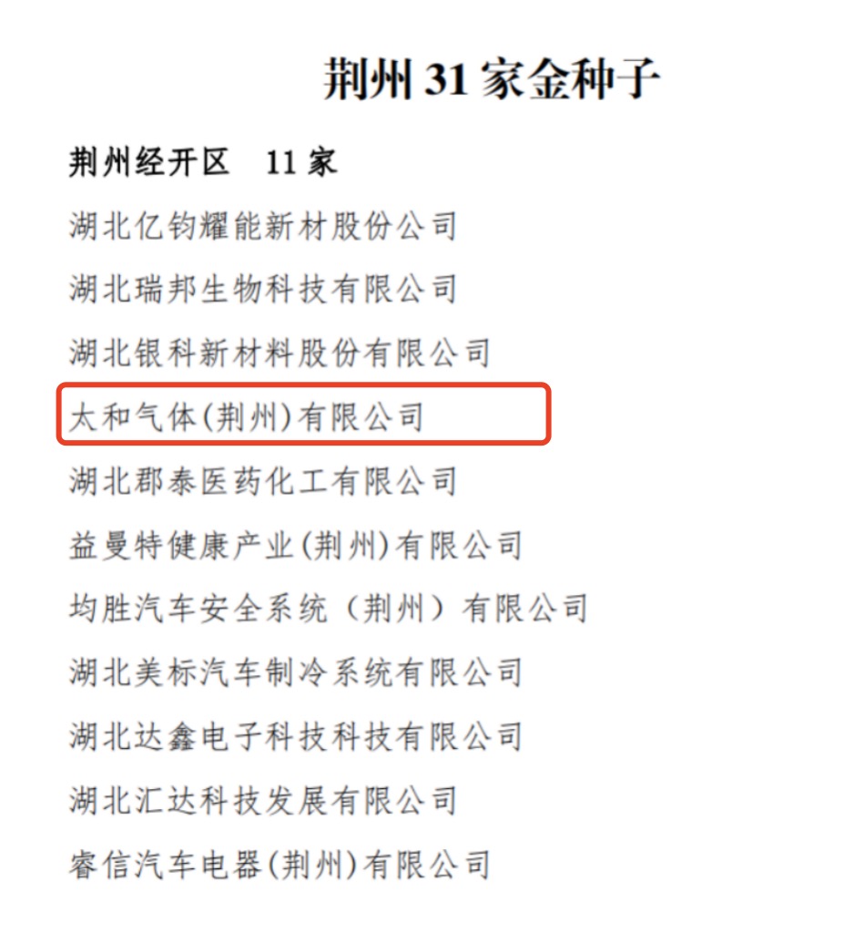 2024年2月,2024-2025年度湖北省上市后備“金種子”企業(yè)名單發(fā)布,太和氣體(荊州)有限公司入選。“金種子”企業(yè)是省級重點培育的上市后備企業(yè),省委、省政府將給予政策扶持、上市服務等多方面支持。